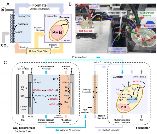 이 전기화학-바이오 하이브리드 시스템은 전기화학 전환반응이 일어나는 전해조와 미생물 배양이 이루어지는 발효조가 연결된 형태로 전해조에서 이산화탄소가 포름산으로 전환되면, 이 포름산을 발효조에 공급해 커프리아비더스 네케이터(Cupriavidus necator)라는 미생물이 탄소원으로 섭취해 미생물 유래 바이오 플라스틱인 폴리하이드록시알카노에이트(polyhydroxyalkanoate, PHA)를 생산한다.