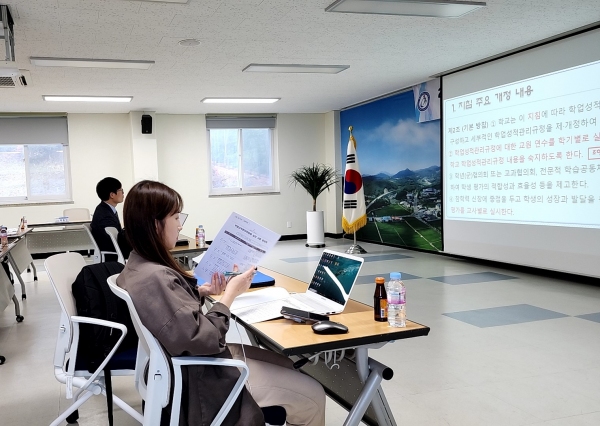 아울러 담당 장학사 박윤미는 학업성적관리규정 개정과 학업성적관리위원회의 역할에 대한 컨설팅을 함께 실시하고, 이번 연수로 학업성적관리 지침에 대해 정확히 숙지하고 소홀함이 없도록 노력해주길 바란다고 당부했다.