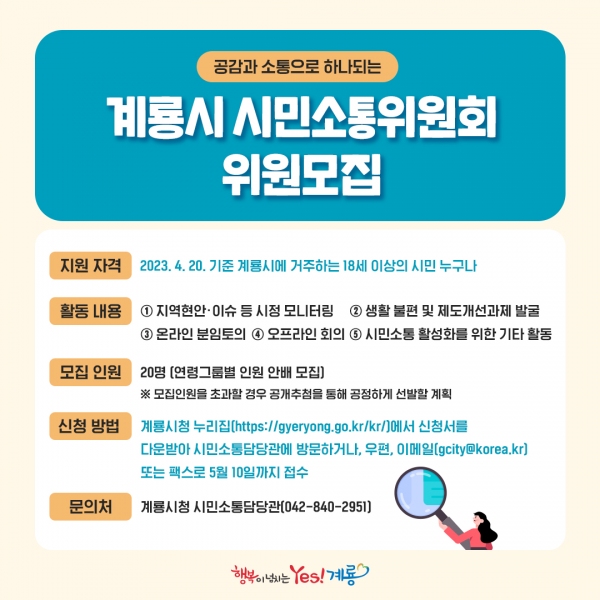 계룡시가 민선8기 공약사업 중 하나인 ‘시민소통위원회 출범’을 위해 내달 10일까지 제1기 시민소통위원 20명을 모집한다.