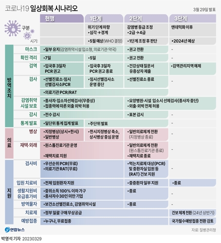 3단계에선 코로나19 대응 체계가 일반 의료체계로 완전히 전환돼 방역과 의료 조치, 지원책이 모두 사라진다.