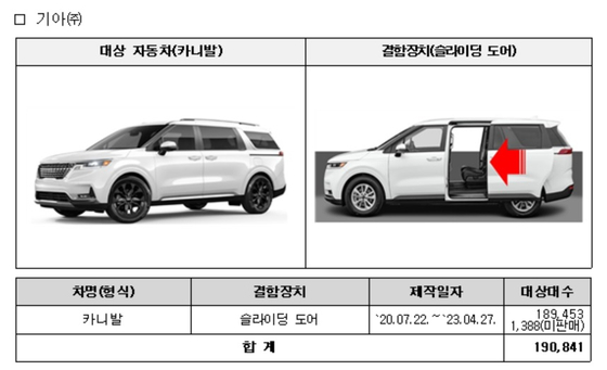 기아에서 제작, 판매한 카니발 19만 841대는 슬라이딩 도어가 닫히기 직전에 탑승 또는 하차 하는 과정에서 신체 일부가 문 사이에 끼여 상해를 입을 가능성이 확인돼 제조사가 자발적으로 리콜한다.