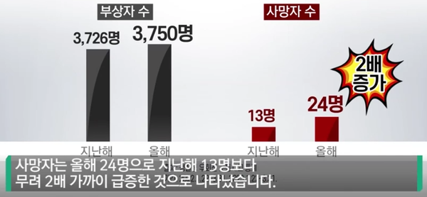 또한 부상자도 3,750명으로 1년 전보다 증가했으며 사망자는 올해 24명으로 지난해 13명보다 약 2배 정도 증가한 통계가 나왔다.