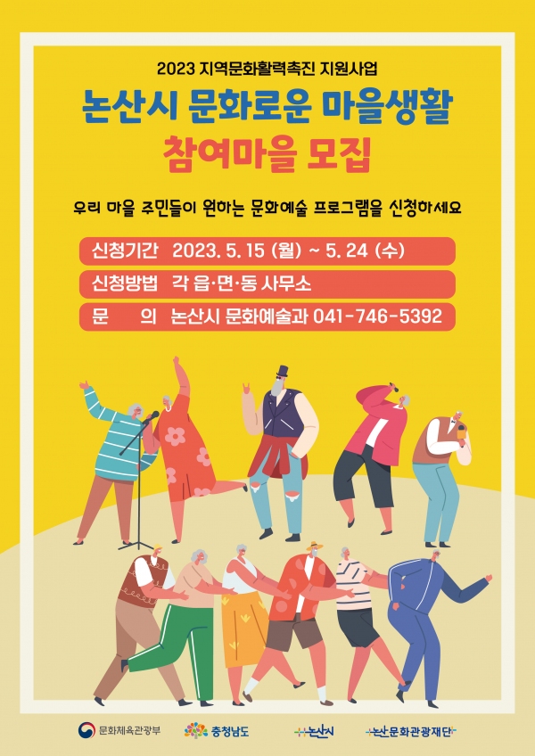 문화를 통해 마을에 활력을 불어넣는 사업이 본격 추진된다. 논산문화관광재단은 문화체육관광부·논산시 주최 ‘2023 지역문화 활력 촉진 지원사업’에 참여할 마을을 오는 24일까지 모집한다고 17일 밝혔다.