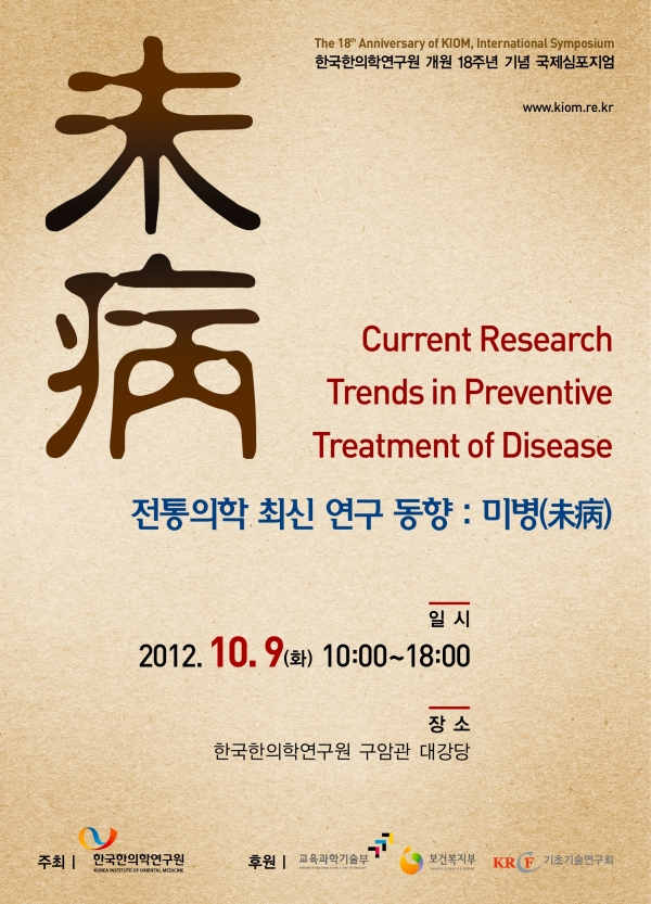 한국한의학연구원(원장 최승훈)은 9일 연구원 대강당에서 ‘전통의학 최신 연구동향: 미병(未病)’(Current Research Trends in Preventive Treatment of Disease)을 주제로 개원 18주년 국제심포지엄을 개최한다.
