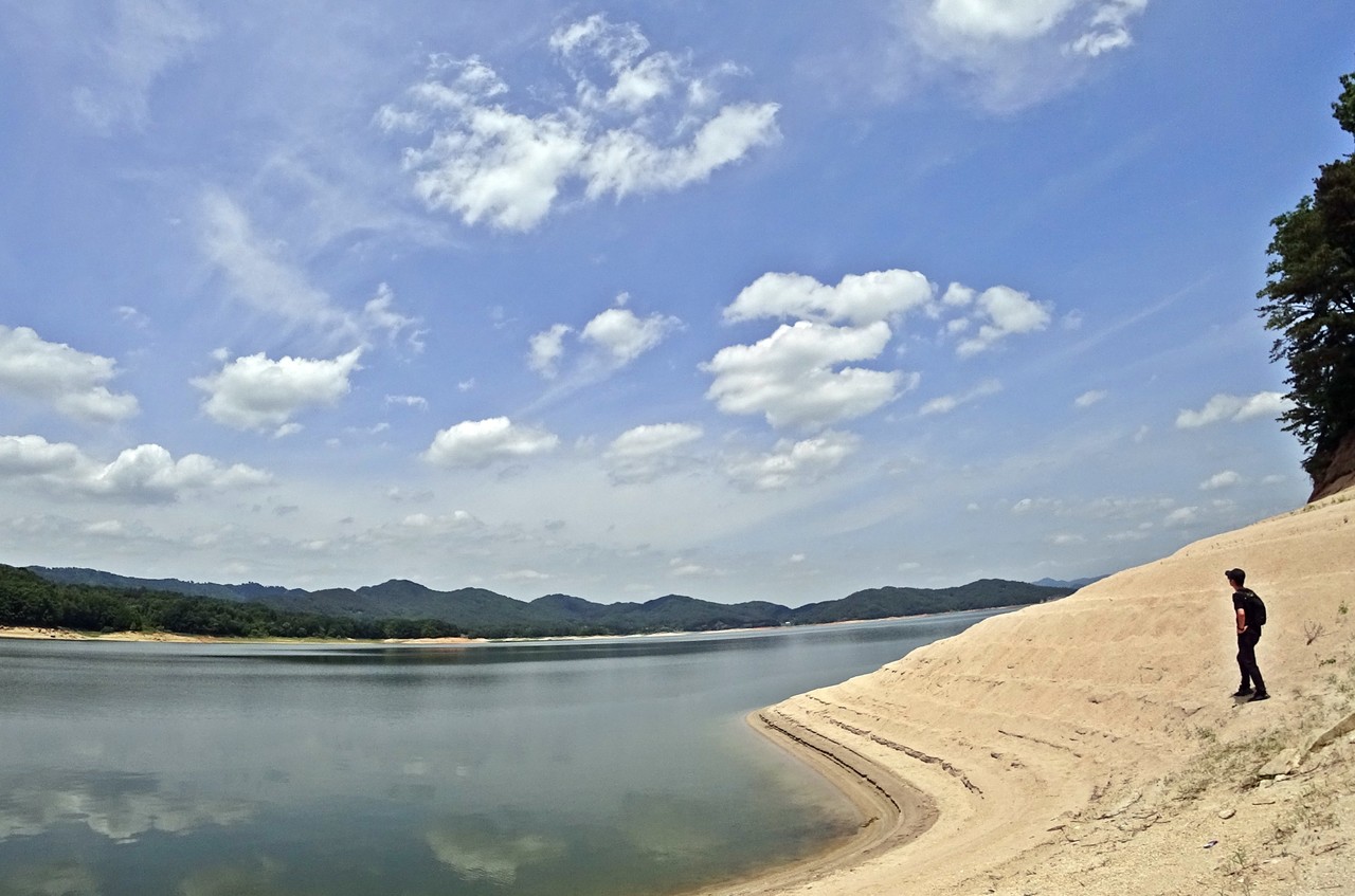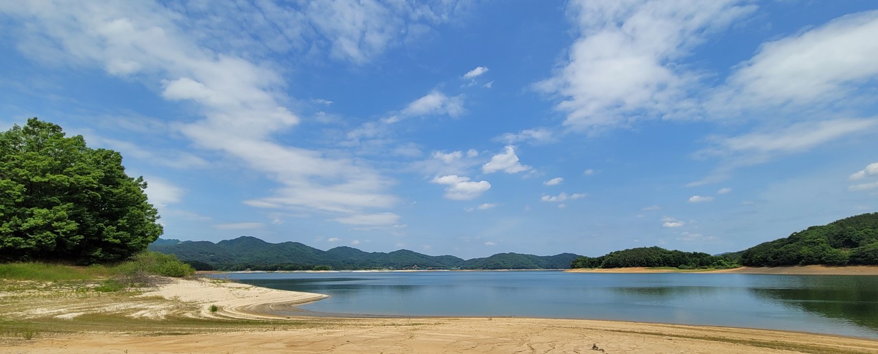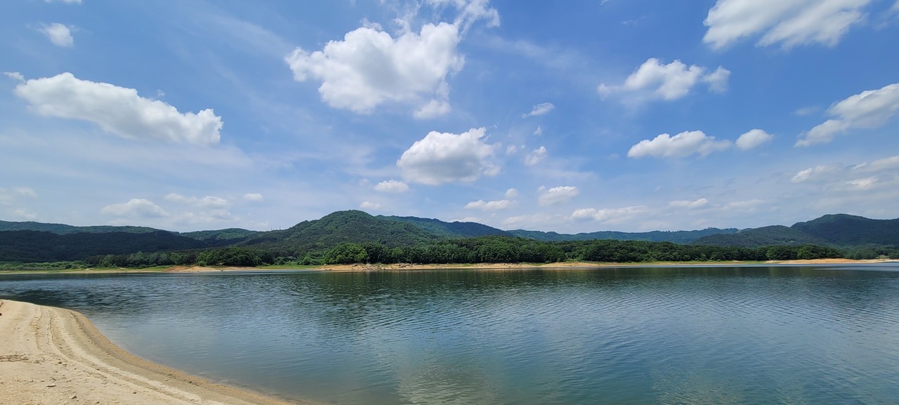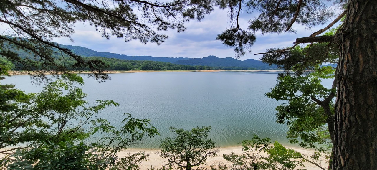 이 길의 풍경을 이렇게 읊었다. 호수에 풍경을 풀었다/지상의 시간이 수면을 타고 번진다. 차분하고 고요하다/호숫가를 걷는다. 빈손을 움켜잡는다/여과되지 않은 기억들 바람으로 치환된다… (김미진 詩 환절기) 개인적으로 가장 좋아하는 조망 포인트다. 호수풍경을 풀어놓은 벤치에 슬그머니 앉는다. 일단 물 한 잔. 오래 걷진 않았지만 습관처럼 물 한 모금. ‘흐리고 비’라던 일기예보와 달리 하늘이 파랗다. 구름마저 예술이다. 벤치 앞에서 호수의 속살 같은 뷰를 휴대폰에 담는다. 어떻게 찍어도 작품이 되는 뷰. 서해 어느 섬에 온 듯하다. 삼각대를 세워놓고 물가 쪽으로 내려간다. 프레임 속으로 직접 들어왔다. 다양한 포즈를 시도해보지만, 역시나다. 어색한 표정 지으며 호숫가를 걷는다. 조금 덥긴 하지만 호수가 주는 휴식이 더 크다. 모퉁이를 돌면 대청호의 장엄이 밀려온다. 바닷가에 온 것처럼 물결 일렁이고 때론 파도처럼 밀려온다. 윤슬은 눈부시게 유혹한다. 층층 물과 뭍의 경계를 걷는다. 감탄사가 절로 나온다.