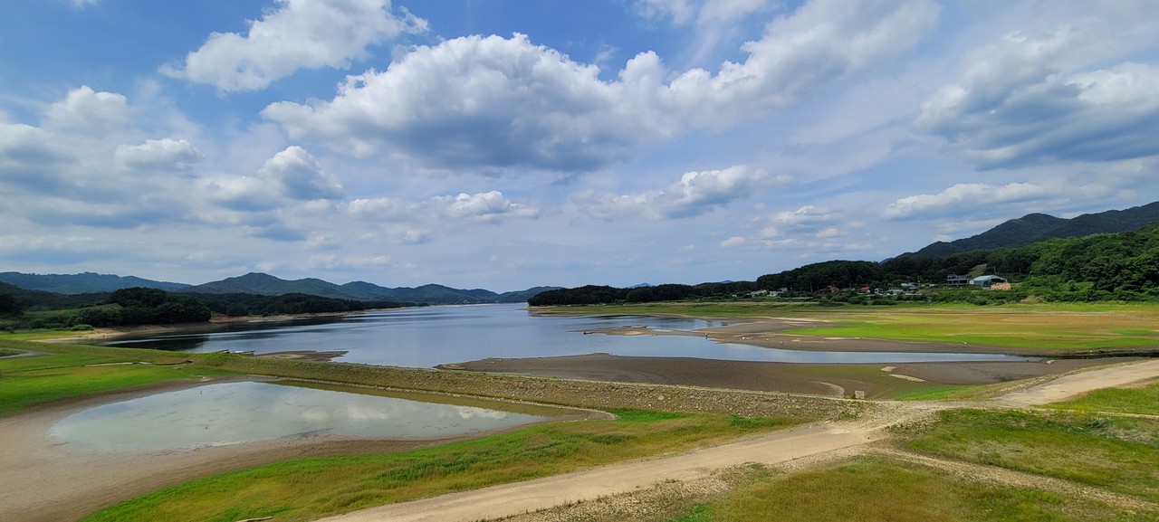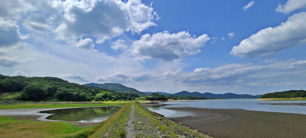 오동선 벚꽃길 인근의 오리요리전문식당 앞을 지나면 흥진마을 둘레길의 본격적인 시작이다. 아, 대청호오백리길 5구간의 시작점은 반대 신상교 쪽이다. 오늘은 반대방향으로 간다. 새 노랫소리 계속되는 호젓한 오솔길. 계절은 계절이다, 온통 녹색이 지배하고 있다. 발길 닿는 곳미다 포토존이다. 걷다가, 오른쪽을 보면 넓은 초지 뒤에서 백골산이 손짓한다. 예전에 왔을 땐 물이 그득했던 곳이 초지로 바뀌어 있었다. 휴대전화 카메라 속에선 초지마저 아름다운 풍경이다. 물이 많이 빠져 낯선 뭍 풍경을 보여주는 곳에서 잠시 머문다. ‘대청호가 생기기 전엔 이곳도 어느 마을이었겠지.’ 이 마을 사람들이 살던 모습들이 흑백필름처럼 스쳐 지나간다. 수몰지 집터를 스쳐 지나간다. 곧 오른편 토끼 등처럼 생긴 토끼봉을 바라보며 걷는다. 토끼봉을 지나면 호수가 제대로 열리면서 이 길의 여름 뷰를 보여주기 시작한다.