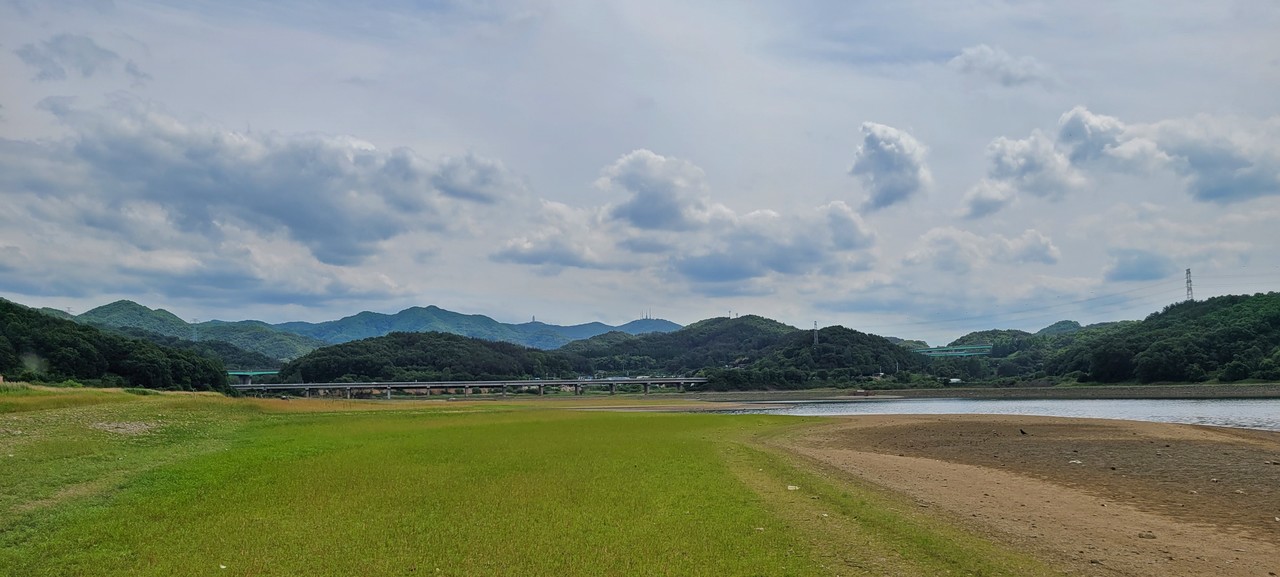 멀리 계족산성이 눈에 들어온다. 대청호오백리길 4구간 황새바위전망대 데크가 아주 가까이 보이고 그 옆으로 거북바위가 보인다. 물가를 걷고 있는데 뒤쪽에서 이야기 소리가 들린다. 중년 여성 네 분이 다가왔다. 곧바로 감탄사가 이어진다. “좋다, 좋아. 너무 평화롭네~~~.” “이런 게 힐링이지.” 노래까지 흥얼거리는 목소리, 행복바이러스가 번진다. 잠시 숲길로 올라간다. 이 길의 공식경로는 물가 길이 아니고 벤치가 있는 숲길이다. 나무와 나뭇잎 사이로 보이는 대청호 풍경도 예술작품이다. 수채화 같은 프레임 속에 초록빛 물결이 압권이다. 물가에서 혼자 걷고 있는 여성이 프레임에 들어온다. 맨발이다. 맨발로 제대로 대청호를 즐기고 있다. 모퉁이를 돌아서니 오픈조망이다. 신상교와 식장산이 정면으로 눈에 들어온다. 3㎞ 남짓 둘레길이 벌써 끝나간다. 신상교를 향해 걷는 걸음, 이곳도 초지 파노라마다. 커다란 민물조개 껍데기가 계속 발 주위에 머문다.