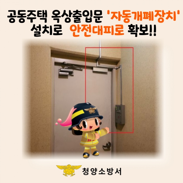 청양소방서(서장 김희규)는 아파트 등 공동주택 화재 발생 시 연기로 인해 지상으로 대피가 불가한 상황을 대비해 옥상 출입문에 화재 감지 자동개폐장치를 설치할 것을 당부했다.