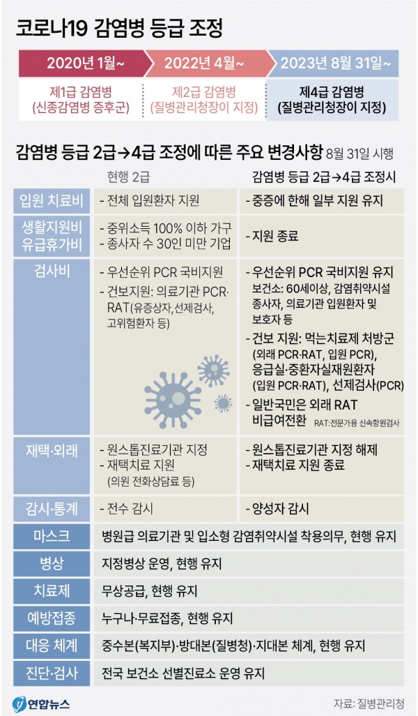코로나19의 등급 하향과 함께 확진 검사와 입원 치료에 대한 비용 지원 역시 줄어들고 확진자에 대한 생활지원비는 사라진다. 구체적으로 재택치료 지원 종료, 생활지원비·유급휴가비 지원 종료, 일반의료체계 전환(모든 병·의원 코로나19 진료 가능), 진단검사(PCR, RAT) 유료 등이 실시된다. 다만 고령자, 면역저하자와 같은 고위험군은 여전히 보호가 필요한 만큼 병원급 의료기관과 입소형 감염취약시설에서의 마스크 착용 의무는 당분간 유지된다. 또 만 60세 이상 연령군 등 고위험군의 신속항원검사비 일부와 중증 환자의 입원치료비 일부 역시 연말까지 이어진다. 백신과 치료제는 무상으로 당분간 공급된다. 아직 코로나1의 여파가 남은 만큼 고위험군과 감염취약시설의 무료 유전자증폭(PCR) 검사를 위한 선별진료소 운영도 당분간 이어진다. 충청권 역시 선별진료소 일부를 지속적으로 운영하는 한편 전담 병상 등을 확보해 감염병 등급 하향에서 발생할 재확산을 준비하고 있다.