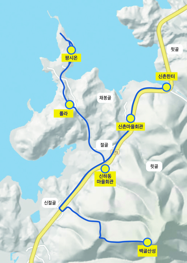 신촌한터(대전 동구 신촌동)→구절골→방축골→신절골→백골산성→신절골→신촌한터