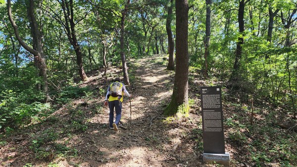 쉬엄쉬엄, 한 걸음 한 걸음 돌계단을 오른다. 숨이 차오르지만 산위에서 불어오는 시원한 바람이 충전 역할을 한다. 약 600m 지점 쉼터를 만난다. 백골산성의 내력이 담긴 표지판이 보인다. 다시 정상을 향해 출발. 지그재그 오르막을 탄다. 8부능선 지점이다. 다시 오르막, 9부능선에 도달해 기력을 충전한 뒤 마지막 스퍼트. 이곳에 산성이 있었음을 짐작게 하는 돌무더기들이 눈에 들어온다. 차근차근 30분 만에 오른 백골산 정상, 힘들었던 순간을 순식간에 잊게 해주는 아름다운 대청호의 풍경과 마주한다. 거친 숨을 몰아쉬면서도 감탄사가 연신 터져나온다.