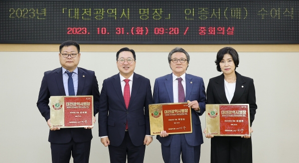 대전시가 31일 중회의실에서 올해 대전시명장에 선정된 3명에게 인증서와 인증패를 수여했다.