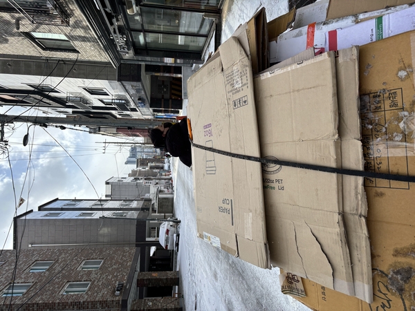 B 할아버지는 전봇대마다 버려진 폐지를 주우며 손수레에 차곡차곡 쌓았다. 무게가 얼마 나가지 않는 작은 박스보다 재활용이 가능한 큰 박스를 위주로 수거했다. 수레가 절반 정도 찬 것 같아 “이 정도면 얼마 나와요?”라고 물으니 “500원도 안 나온다”는 무심한 답이 돌아왔다. 미끄러운 길에도 그가 발길을 계속해서 재촉한 이유다. 하루 평균 6000원. 그가 폐지를 주우며 버는 돈이다. 박스가 많이 나오는 슈퍼나 일부 식당, 전통시장 등은 폐지 받는 사람이 정해져 있어 골목 곳곳에 놓인 폐지를 빨리 수거해야 한다. 그래도 이날은 추워서 폐지가 많은 편이라고 했다.