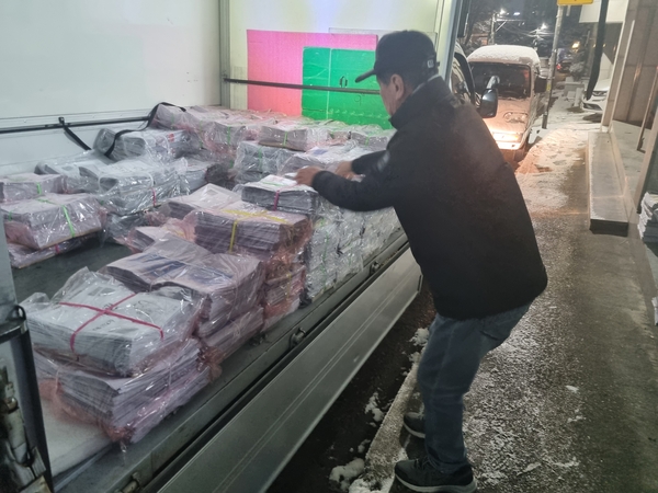왜 하필 폭설이 내리는 날이었을까. 후회가 막심하다. 전날 모 편집국장님과의 거한 음주로 인한 숙취는 신문배달할 시간이 다가올 때까지 쉬 풀리지도 않고 졸음만 쏟아진다. 오만가지 생각을 하며 자다깨다를 반복하다 결국 그 순간이 오고야 말았다. 채 떨어지지 않는 발걸음을 겨우 내디뎌 도착한 대전 서구 탄방동의 신문유통원 대전둔산센터. 맡은 구역은 탄방동과 둔산동이란다. 밤 11시 30분 줄기차게 내리던 함박눈이 멈추고 달빛이 어깨를 토닥인다. 달빛의 위로에 마음이 놓이던 순간을 못 참고 그 사이 각 신문사에서 인쇄된 신문들이 속속 지국으로 도착했다. 분주한 손길로 신문별 분류작업이 시작됐다. 신문은 짐칸에 넣는 순서, 접는 방향까지 모두 정해져 있다. 동선과 그에 따른 배달 신문 종류 등을 고려한 방식이다. 곧 도착할 배달원들이 각자 담당하는 부수만큼 챙겨갈 수 있도록 하기 위해 정리된 신문들은 각 배송지별 부스로 옮겨져 그들의 손에 맡겨진다.