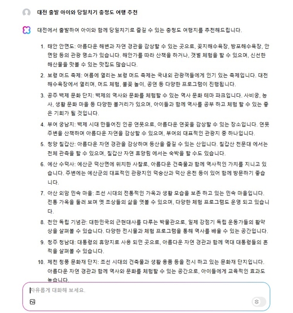 여행 계획은 생각보다 쉽지 않다. 단순한 휴식처, 사람 많은 관광 명소가 아니라 아이들에게 새로운 풍경과 다양한 체험의 기회를 선사할 수 있는 맞춤 여행지를 찾기란 더더욱 어려움이 많다. 어른들만의 여행지와는 달리 어린 아이들과의 여행은 특별히 고려해야 할 사항들이 많아서다. 원하는 여행지를 찾고, 일정 짜고, 예약까지…, 설렘을 안고 여행 계획을 세우다 보면 오히려 넘쳐나는 정보로 인해 막막함을 느낀다. 그러다 ‘다음에 가자’하고 미루기 일쑤다. 그래도 근교라도 가봐야지 하면서 휴대폰을 열고 네이버 검색창에 대전 근교 여행으로 검색하면 가볼만 한 곳 ‘아이와 함께’ 라는 키워드에 90% 이상이 키즈카페, 실내놀이터, 동물원, 도서관들로만 빼곡하다. 날씨 좋은 주말 매번 놀이터나 동물원, 키즈카페 가는 건 지겹기도 하다. 그래서 이번엔 네이버판 챗GPT인 대화형 인공지능(AI) ‘클로바X’를 활용해 무계획 당일치기 여행을 가보기로 했다.