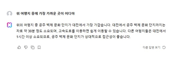 클로바X에게 던진 첫 질문이다. 클로바X는 무서운 속도로 여행지를 추천했다. 태안 안면도부터 제천 청풍문화재단지까지 총 10곳. 구체적인 여행지 설명까지 이미 여행을 다녀온 느낌이다. 추천해준 여행지가 너무 많아 다시 10곳의 여행지 중 가장 가까운 곳은 어디인지 되물었다. 그러자 백제문화단지(충남 부여)를 골라줬다. 여행지가 바로 정해졌다. “그럼 백제문화단지는 어떻게 가?” 척척박사가 따로 없다. 자가용, 대중교통, 셔틀버스 이동수단 방법과 주소, 요금 등에 대한 정보가 좌르륵 나온다.