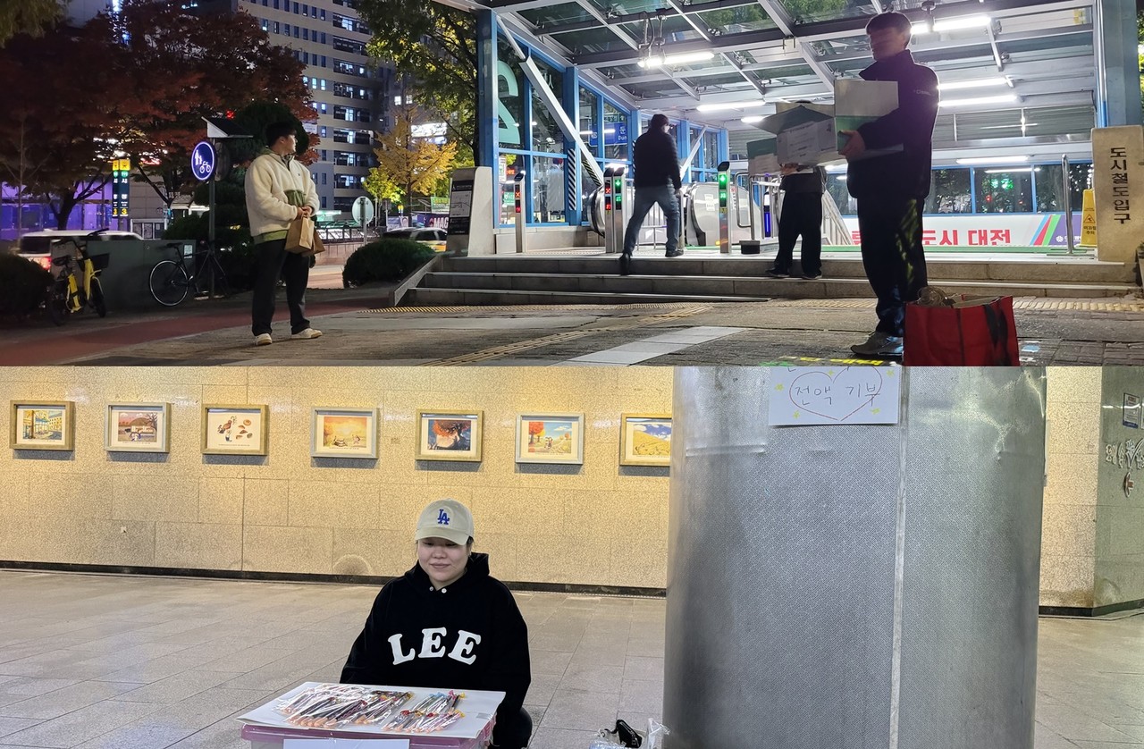 그 온기를 직접 느껴보기 위해 월간 이이김김 기자들은 하루 동안 자영업자가 돼 빵과 볼펜을 팔았다. 인도 위 작은 상자가 기자들의 가게였다. 낯선 손님과 마주하며 계산기를 두드리는 사이 ‘버틴다’는 말의 진짜 뜻이 피부에 와 닿았다. 빵과 볼펜 판매로 22만 8375원을 벌었다. 준비 과정 지출은 13만 3000원이었다. 카드 수수료 1602원을 제외한 순수익은 약 9만 5000원. 여기에 한 선배가 숙고 끝에 식사비 7만 2000원을 자비로 부담한 덕분에 장부엔 창피하지 않을 정도로 기부할 수익이 남았다. 금액은 크지 않았지만 하루 동안 번 돈 전액을 대전청년내일재단에 기부했다. 작은 돈이지만 청년들의 내일을 응원하는 마음을 담기에는 충분했다.