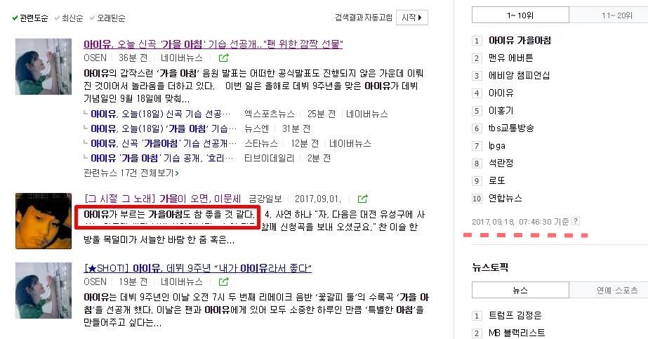 ... 으로 시작하는 양희은의 노래 '가을아침'도 이 무렵 자주 듣는 노래다. 아이유가 부르는 가을아침도 참 좋을 것 같다는 생각도 해 본다. (그리고 이 글을 쓴 17일 뒤인 9월 18일 데뷔 9주년을 맞은 아이유는 두 번째 리메이크 음반 '꽃갈피 둘' 수록곡 '가을아침'을 선공개 했다.)