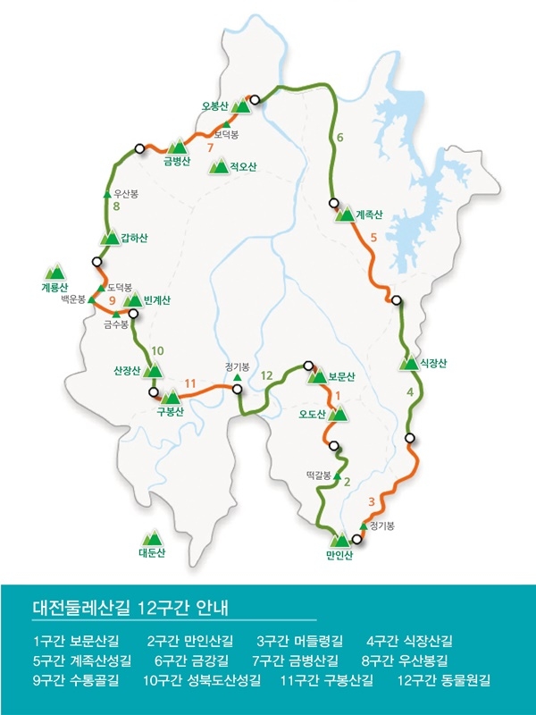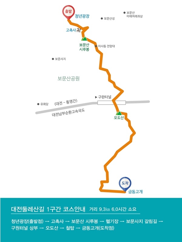 대전의 산들을 연결한 대전둘레산길은 모두 12개 구간으로 나뉘어 있다. 1구간당 평균 10㎞, 대략 6시간 코스다. 1구간 보문산길은 보문산 청년광장에서 출발해 시루봉, 보문사지 갈림길, 대전남부순환고속도로 구완터널 상부, 오도산, 금동고개로 이어진다. 거리는 9.3㎞, 약 6시간 정도 잡으면 된다.