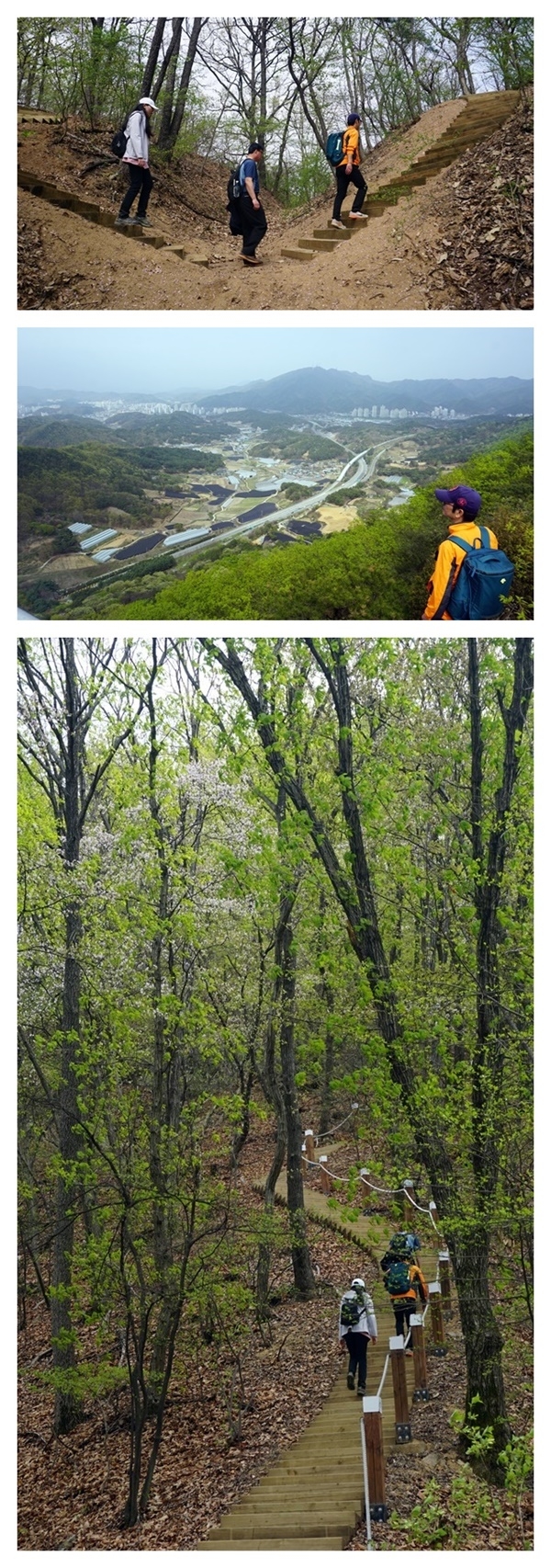 계속해서 하산길을 타다 대전남부순환고속도로 구완터널 위를 지나고 나면 본격적으로 오도산 등정이 시작된다. 나무계단이 끝없이 펼쳐지는데 그리 겁낼 건 없다. 완연한 봄, 연한 신록(新綠)과 진한 초록이 어우러진 신선한 숲의 맑은 공기를 들이마시면서 천천히 발걸음을 옮기면 힘들다는 생각보단 마음 속 치유, 힐링의 순간을 마주하는 기쁨을 얻게 된다.