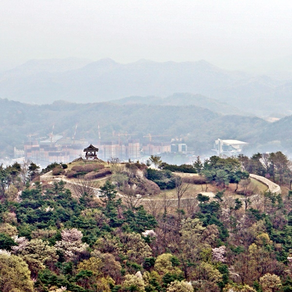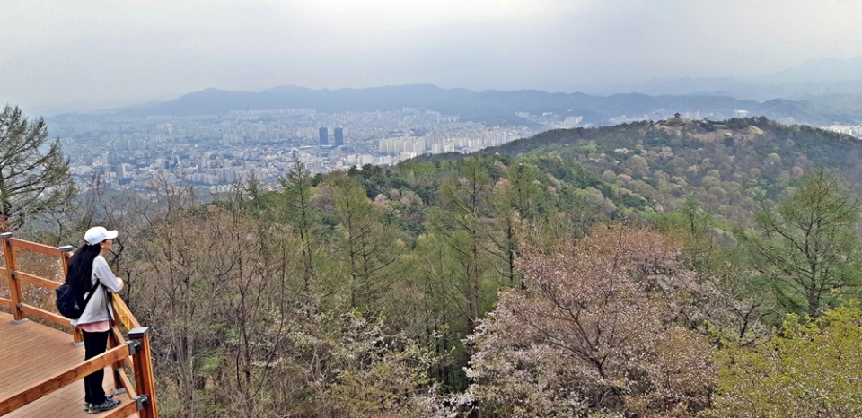 고촉사에서 시루봉까진 데크 계단길로 연결돼 있다. 하얀 산벚꽃과 다홍빛 철쭉·진달래, 노란 개나리 등 봄꽃의 향연을 느끼면서 차근차근 발걸음을 옮기면 금세 시루봉에 도달한다. 시루봉 평평한 곳에 자리한 보문정(寶文亭)에 오르면 확 트인 조망이 눈에 들어온다. 대전둘레산길의 의미가 확실하게 각인되는 것도 바로 여기서부터다. 보문산성 장대루(將臺樓)를 중심으로 펼쳐지는 전망이 압권이다. 대전 발전의 모태라고 할 수 있는 대전역(철도트윈타워) 주변 원도심과 동구의 신흥개발지구인 가오동이 시원하게 펼쳐진다.