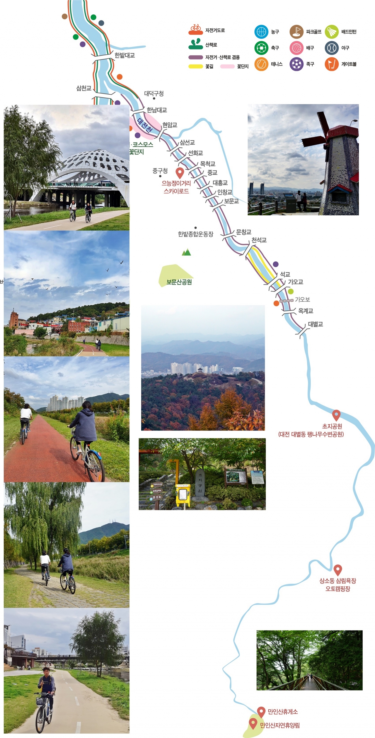 대전이 대도시로 발전할 수 있었던 원천은 대전천이다. 이 물길을 중심으로 사람들이 모여 살았고 시민 생활에 필요한 용수를 대전천이 공급했다. 대전천은 유등천·갑천과 달리 발원지가 대전에 있다. 대전과 충남 금산의 경계에 있는 만인산 봉수레미골(동구 하소동)에서 발원해 대덕구 오정동에서 유등천으로 흘러들어간다. 하천연장은 22.4㎞에 이른다. 발원지부터 중구 옥계동 옥계교까지 14.6㎞ 구간은 지방2급 하천이고 여기서부터 다시 유등천 합류지점까지 7.8㎞은 지방1급으로 분류되는데 지방1급 하천 구간 유역이 ‘대전시내’로 불린다. 유등천과 합류하기 전 보문중·고등학교 앞에서 식장산에서 발원한 대동천을 흡수한다.