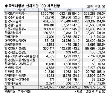 국토해양부 산하 19개 기관의 부채총액이 166조 원을 넘는 것으로 확인됐다.정부 출연.출자 공공기관마저 채무불이행 사태를 걱정해야 할 판이다.자유선진당 권선택 원내대표(대전 중구)에 따르면 국토해양부 산하기관들에 대한 재무현황을 분석한 결과, 국토부 산하 19개 기관 중 8개 기관이 1조 원 이상의 부채를 갖고 있는 것으로 나타났다.또 자본보다 부채비율이 높은 이른바 자본잠식 기관도 8개에 달하는 등 재정구조가 매우 부실한 것으로 분석됐다.국토해양부 산하기관 중에서 부채총액이 가장 많은 기관은 한국토지주택공사(LH공사)로 부채액만 109조 원에 이르렀다.한국도로공사(21조 8000억 원), 한국철도시설공단(14조 3000억 원) 등이 뒤를 이었다.이와 함께 총 자산 중 부채비율이 가장 높은 기관은 한국컨테이너부두공단으로 자본금 1조 1581억 원에 부채는 1조 1528억 원으로 총 자산 중 부채비율이 무려 99.5%에 달했다. 다음으로는 한국건설교통기술평가원(92.8%), 한국감정원(89.7%), 한국토지주택공사(84.0%) 순이었다. 권 의원은 “국토해양부 산하기관이 대규모 자금 투입이 필요한 SOC사업을 추진한다는 특수성을 감안하더라도, 부채총액이 지나치게 많다”며 “정부가 출연.출자 등의 형태로 사실상 지배를 하고 있는 공공기관의 경우 해당기관이 지급기일에 상환하지 못하는 채무불이행이라도 발생하는 날에는 국가 재정건전성에도 치명적인 영향을 미치게 된다”고 지적했다. 권 의원은 또 “국토부 산하기관들의 재무건전성 문제가 심각한 수준인 만큼, 4대강 사업, 보금자리 주택 등과 같은 대규모 정책사업 추진에 대한 제고가 필요하다”고 강조했다.