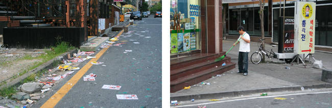 ‘특별 이벤트 12시 이전 여자 손님 공짜’, ‘신규 오픈 소주가 공짜’어김없이 찾아오는 해질녘, 화려한 네온사인을 뿜어내는 유흥가 주변은 불야성이고 인파는 몰려든다.밤이 돼야 활력을 찾는 거리 곳곳의 각종 음식점들과 술집 등은 왁자지껄한 사람소리로 가득찬다.누군가는 스트레스를 풀며 즐기지만 누군가는 한 숨이 절로 토해지는 공간이 유흥가다.주변 주민들과 환경미화원들이다.취객의 허리춤을 잡아채는 온갖 전단지가 도로와 인도를 가리지 않고 지천으로 깔리기 때문이다.전단지 대부분은 배포를 넘어 살포 수준이다.광고물은 신규 오픈 음식점, 대리운전, 각종 유흥주점, 낯 뜨거운 사진과 서비스 홍보문구까지 가지각색이다.보행에 지장을 줄 정도로 줄기차게 나눠주는 전단지는 양반 축에 든다.오토바이를 타고 골목 곳곳을 돌아다니면서 명함을 뿌리는 이가 있는 방면, 차를 타고 전단지를 바닥에 살포하는 장면도 쉽지 않게 볼 수 있다.이에 뒤질세라 청테이프로 도로 바닥에 견고히 붙여 놓은 광고물은 현기증을 유발시키기에 충분하다.이런 행위 모두가 불법은 아니다.관계 구청에 적정금액의 수수료를 지불하고, 사람이 직접 사람들에게 전달하는 경우 등이 그렇다.법을 지키며 전단지를 배포하는 사람들은 그리 많지 않다는 것이 문제다.유흥가 주변의 광고전단지는 신고도 하지 않고 오토바이와 차량을 이용해 소독차 방역하듯 마구잡이로 살포하고 있는 것이다.매일 새벽이면 가로환경관리요원들을 투입해 청소를 하지만 넘쳐나는 전단지는 빗자루로 쓸어담기에도 벅찰 지경이다. 대전시가 불법 전단지 차단을 위해 두 팔 걷고 나섰다.시는 주변상가 주민 참여 하에 자율클린활동을 전개하고, 청소원을 고정 배치시킬 계획이다.불법유통광고물 배출업소에 대한 특별관리로 위생감시 활동을 강화하고, 쓰레기불법투기 상설단속반을 상시 운영해 계도 단속활동을 강화시킬 방침이다.서구청 관계자는 “환경관리요원들의 애로사항이 이만저만 아니다. 바닥에 테이핑한 광고는 일일이 손으로 직접 떼어내 처리를 한다”며 “그러나 비가 오는 날에는 광고지 재질상 쓸기조차 어려워 청소하기가 매우 힘들다”고 말했다.유흥가 주변에 한정돼 불법광고물이 홍수를 이루는 것은 그나마 다행이라는 치우는 이들의 푸념에서 쓰레기 천국의 애환이 묻어난다.