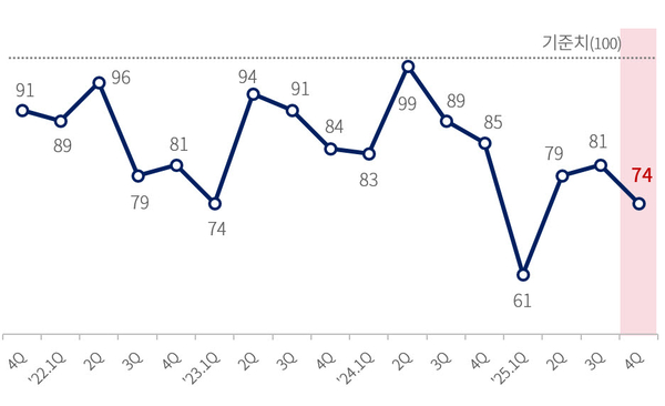 지역별로 봐도 모든 지역에서 전망치가 기준(100)를 밑돌았다. 특히, 대구(60)와 경북(68), 부산(66)은 관세 여파로 지수가 70선 이하를 기록했다. 3대 석유화학단지가 위치한 전남(60), 충남(71), 울산(74)도 주력 제품의 수요둔화와 글로벌 공급과잉으로 수익성 악화가 지속되면서 전분기보다 지수가 일제히 하락한 것으로 나타났다.