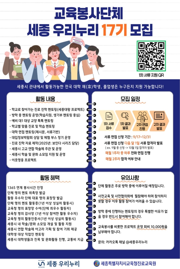 세종시교육청 진로교육원과 협력해 진로·진학 멘토링을 운영하는 ‘세종우리누리’가 제17기 멘토 및 임원진을 모집한다.