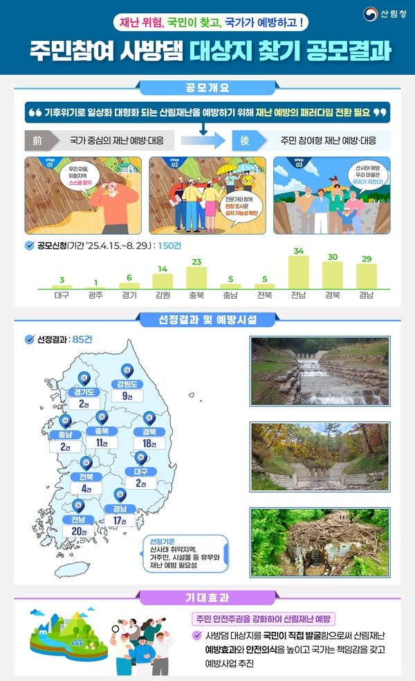 최현수 산사태방지과장은 “이번 공모를 통해 산림재난 예방의 패러다임을 전환하고 주민의 의견을 반영해 국가가 책임감을 갖고 사방사업을 추진하겠다”고 말했다.
