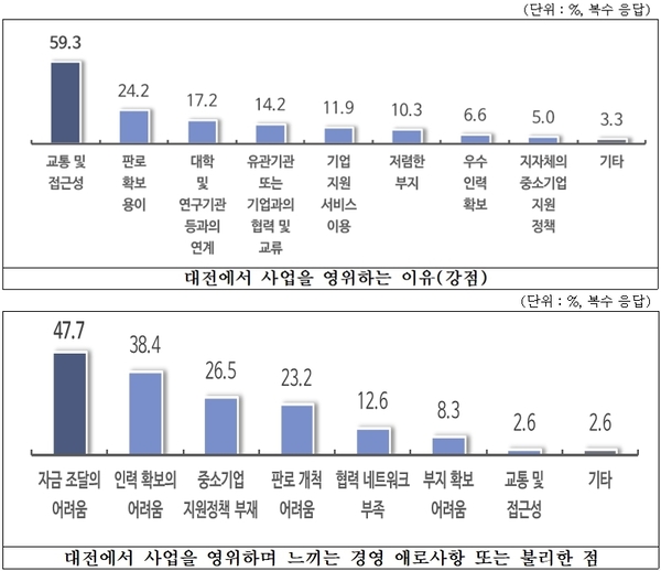 대전시에서 사업을 영위하는 주요 이유(강점)로는 ‘교통 및 접근성’(59.3%)이 가장 많이 꼽혔으며, ‘판로 확보 용이’(24.2%), ‘대학 및 연구기관 등과의 연계’(17.2%) 등이 뒤를 이었다.