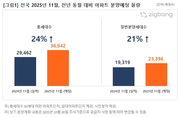 3일 직방에 따르면 이달 전국 아파트 분양 예정 물량은 총 3만 6642세대로, 전년 동월(2만 9462세대)보다 24% 증가할 예정이다. 이중 일반분양 세대수는 2만 3396세대로 전년(1만 9319세대) 대비 21% 늘어날 전망이다.