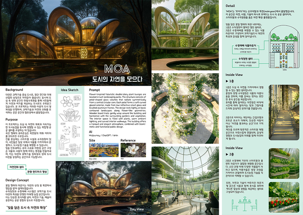 전지원 학생은 ‘AI기반 공공디자인’ 수업에서 진행한 프로젝트 ‘도시의 자연을 모으다, MOA’로 출품, 수상했다. 이 수업은 지역사회 환경 개선을 목표로 하며 AI 생성 도구를 활용해 디자인 아이디어를 구체화하는 과정에 중점을 뒀다.