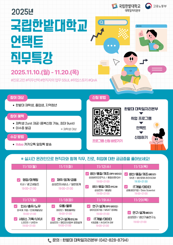 국립한밭대학교 대학일자리본부가 오는 10일부터 20일까지 저녁 시간대에 현직자와의 실시간 온라인 ‘2025 언택트 직무특강’을 진행한다.