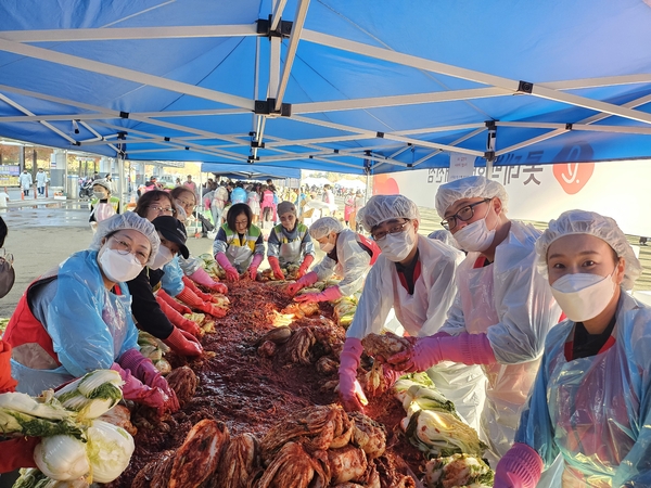 롯데백화점 대전점이 12일 엑스포 남문광장에서 ‘따뜻한 겨울나기 김장 대봉사’ 행사를 진행하는 가운데 정승욱 대전점장과 샤롯데 봉사단 10여 명이 김장 김치를 담그고 있다. 이들은 봉사활동 뿐만 아니라 소외계층을 위한 사랑의 후원금도 전달했다. 정승욱 대전점장은 “앞으로도 대전점은 지속적인 사회공헌 활동을 통해 지역사회와 더불어 살아갈 수 있도록 최선을 다하겠다”고 말했다.