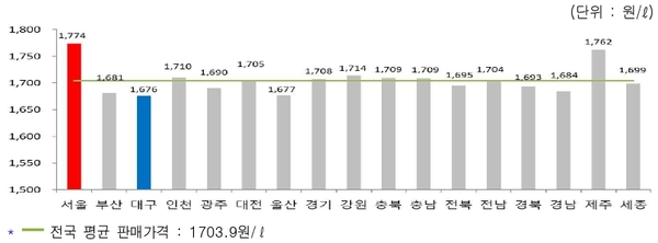 지역별로 가격이 가장 높은 서울은 전주 대비 12.8원 상승한 1773.9원, 가격이 가장 낮은 대구는 18.6원 오른 1675.7원으로 각각 집계됐다.