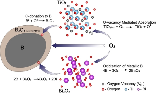 연구팀은 산소 결함이 풍부한 TiO₂ 구조체에 Bi₂O₃의 빠른 산소 공급 능력과 발열 특성을 결합한 나노스케일 코팅을 설계했다. 이 구조는 보론 표면에 형성되는 B₂O₃ 피막을 효과적으로 제거해 산소 전달을 가속화하고 점화 지연 시간을 단축시키며 연소 효율을 크게 향상시킨다. 최적화된 코팅을 적용한 결과 순수 보론 대비 점화 지연 시간이 28% 단축되고 연소 발열량은 21.6% 증가하는 성능 향상이 확인됐다.