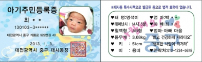 대전 중구 대사동주민센터가 올해부터 신생아에게 ‘아기주민등록증’을 발급키로 해 눈길을 끌고 있다. 아기용 주민등록증이 법적인 효력은 없지만 주민들에게 출산 장려 분위기를 전달할 수 있을 것이란 게 주민센터의 기대다. 이 등록증은 성인의 주민등록증과 같은 크기로 앞면에는 아기 이름과 사진, 주민등록번호 등이 새겨졌고, 뒷면엔 태명과 태어난 시각, 혈액형 등이 기록된다. 이달 1일부터 출생 신고된 신생아가 발급 대상이며 신청서와 아기 얼굴 사진 1장을 준비해야 한다.