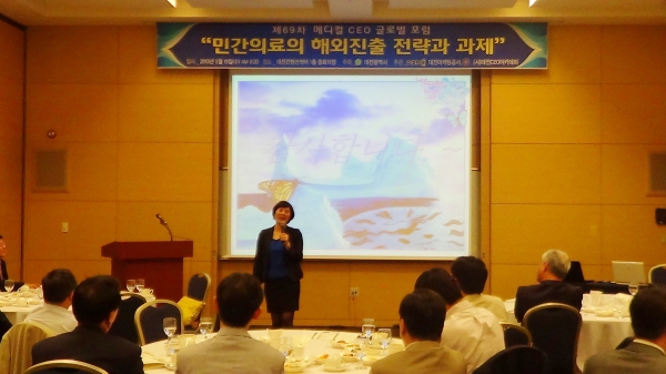 15일 대전컨벤션센터에서 열린 제69차 메디컬CEO글로벌포럼에서 김희정 강동경희대병원 국제교류팀장은 ‘한국의료 세계화는 어떻게 해야 하는가’를 주제로 강연에 나서 “무한경쟁시대를 맞아 의료계도 유통업계처럼 대형화·특성화가 가속화 되고 있다. 양질의 이미지로 한국의료 브랜드를 개발해 해외진출 전략을 모색해야 한다”고 강조했다.