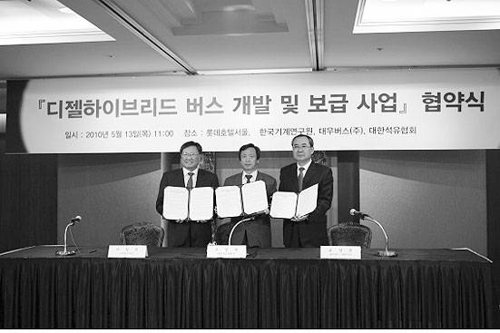 한국기계연구원이 디젤하이브리드 버스 개발과 보급을 위해 대한석유협회, 대우버스㈜와 업무협약을 13일 체결했다.세 기관은 협무협약을 통해 ▲ 디젤 하이브리드버스 차량의 개발 ▲ 6개 지자체(인천, 과천, 대전, 대구, 부산, 여수)의 시범운행을 통한 성능평가 ▲ 기술자료 및 정보교환, 전문 인적자원 상호 활용, 클린디젤 글로벌포럼 운영 등을 협력키로 결정했다.이상천 한국기계연구원 원장은 이번 협약으로 “국내 자동차 산업과 정유 산업의 국가 경쟁력을 높이고, 국내·외 시장 보급을 더욱 활성화해 그린카 4대강국 진입을 위한 견인차 역할을 할 계획”이라고 밝혔다.
