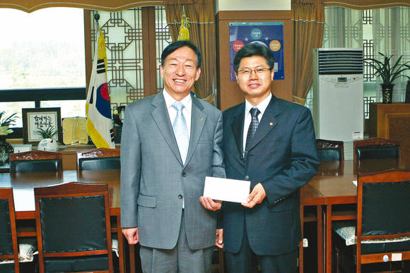 김명수 한밭대학교교수가 13일 설동호 총장을 만나 장학금으로 5000만 원을 기부했다. 김 교수의 장학금은 자신의 부친상 조의금으로 그 의미를 더했다. 김 교수는 한밭대 출신으로 평소에도 각별한 모교사랑을 실천하고 있고 지금까지 1600여만 원의 장학금을 기부했다. 한밭대는 김 교수의 제자사랑 정신을 기려 ‘김명수 장학금’을 만들어 어려운 학생들에게 학비 등을 지원할 계획이다.