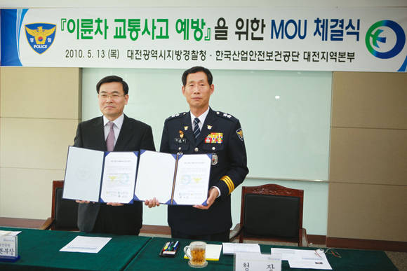 이륜차 교통사고 예방을 위한 MOU체결식이 열린 13일 강찬조 대전지방경찰청장(오른쪽)과 한정열 한국산업안전보건공단 대전지역본부장이 협약서에 서명후 포즈를 취하고 있다. 대전지방경찰청 제공