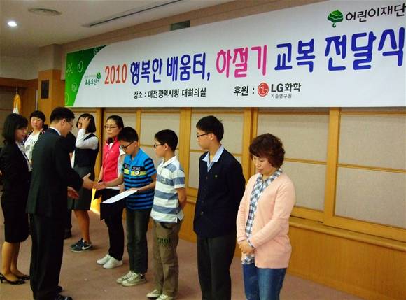 LG화학기술연구원이 지난 14일 시 대회의실에서 '2010 행복한 배움터, 하절기 교복 전달식'을 갖고참여한 학생과 학부모들에게 증서를 수여하고 학업 정진을 독려했다. 저작권자 © 금강일보 무단전재 및 재배포 금지 최현애 기자 bluebird@ggilbo.com 다른기사 보기 SNS 기사보내기 이메일(으)로 기사보내기 다른 공유 찾기 기사스크랩하기 댓글삭제 삭제한 댓글은 다시 복구할 수 없습니다. 그래도 삭제하시겠습니까? 비밀번호 닫기 기사 댓글 0 댓글 접기 댓글입력 권한이 없습니다. 댓글 내용입력 비회원 로그인 이름 비밀번호 댓글 내용입력 댓글쓰기 계정을 선택하시면 로그인·계정인증을 통해 댓글을 남기실 수 있습니다. 회원 로그인 비회원 글쓰기 이름 비밀번호 자동등록방지 로그인 옵션 창닫기 추천기사 [오늘의 금값시세] 11월 26일 금시세(순금·24k)는? [오늘의 운세] 26일 수요일 나의 운세는? 노타 주가, 급등... 호재는?