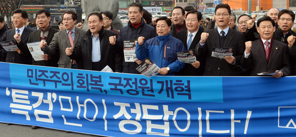 민주당 대전시당은 16일 대전역 서광장에서 국가기관 대선 개입 의혹과 관련, 김용판 전 서울경찰청장 1심 무죄 판결을 규탄하고 특검 도입을 촉구하는 거리홍보전을 가졌다.