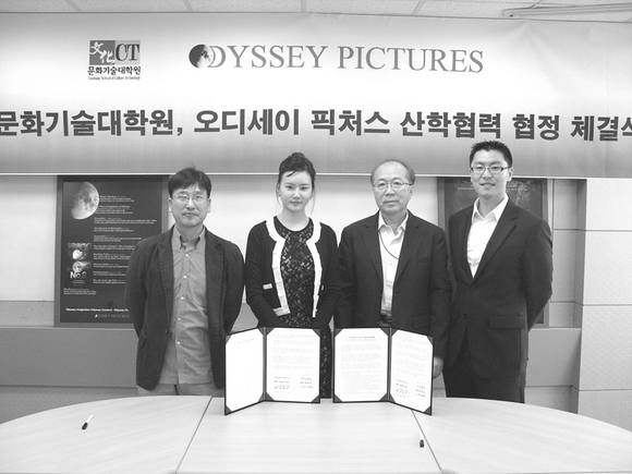 원광연 KAIST 문화기술대학원장과 노준용 교수, 오디세이픽처스 Aurora Lee, 김광덕 공동대표가 17일 오전 10시 KAIST 문화기술대학원 대회의실에서 산학 간 상호교류 및 협력을 위한 양해각서를 체결한 후 기념촬영을 하고 있다. 왼쪽부터 김광덕, Aurora Lee 오디세이픽처스 공동대표, 원광연 KAIST 문화기술대학원장, 노준용 교수KAIST와 국내 영화사가 미국 할리우드 등 글로벌 미디어시장 진출을 위해 손잡았다.KAIST는 문화기술대학원이 국내 영화기획?제작사인 (주)오디세이픽처스와 컴퓨터그래픽 등 영화제작 관련기술 지원과 문화콘텐츠 분야에서 상호협력 및 교류를 위한 양해각서를 체결했다고 17일 밝혔다.이날 양해각서 체결로 KAIST 문화기술대학원은 비주얼 미디어 랩(Visual Media Lab)에서 자체 개발한 컴퓨터그래픽(CG)기술과 CG영상을 창조하기 위한 각종 특수효과기술, 디지털 스토리텔링 기술지원 등을 통해 오디세이픽처스의 할리우드 및 세계시장 진출을 적극 도울 계획이다.오디세이픽처스는 영화홍보 대행사로 2005년부터 영화기획?제작에 본격적으로 뛰어 든 영화사다. 할리우드용 스토리텔링 개발을 중심으로 RD센터를 설립하고 운영하는 등 현재 20편 이상의 할리우드용 콘텐츠를 보유하고 있다.또 오디세이픽처스는 할리우드의 메이저급 영화사와 신(神)이 인간을 창조한 이후 신과 인간 사이에서 벌어지는 악연과 이를 둘러싼 음모를 주요 스토리로 하는 S.F. 액션 2부작 ‘No. 8'의 공동제작을 추진 중이다.이를 위해 지난 2008년 부산국제영화제에서 중국 절강금구영화공사로부터 300만 달러를 유치했다.문화기술대학원에는 할리우드의 세계적 독립프로덕션 ‘리듬앤드휴스’에서 영화의 특수효과 소프트웨어 개발자로 풍부한 경험을 자랑하는 노준용 교수(38세)를 비롯, CG, 가상현실, 디지털 영상기술 등 영화와 디지털미디어 분야의 연구원들이 상당 수 포진해 있다.노준용 교수의 경우 ‘가필드’, ‘나니아 연대기‘, ’슈퍼맨 리턴즈‘ 등 여러 편에 달하는 할리우드 대작의 영상특수효과 개발에 참여했다. 작년 8월 노 교수팀은 자체 CG기술을 활용해 만든 애니메이션 ’고양이 길들이기‘가 세계 최고의 컴퓨터그래픽스학회인 SIGGRAPH가 주관한 'SIGGRAPH 2009 컴퓨터 애니메이션 페스티벌’에서 우수작으로 뽑혀 올 5월부터 9월까지 영국, 호주, 뉴질랜드, 코소보 등에서 열리는 5개의 국제 애니메이션 페스티벌에 초청작으로 상영된 바 있다.