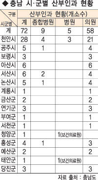 #1. 청양에 거주하는 김모씨 부부는 최근 자녀 출산을 앞두고 고민이 적잖다.군내에도 분만시설을 갖춘 보건의료원이 있지만 공중보건의가 맡고 있어 산모들이 이용을 꺼리고 있다.분만 시설이 열악한데다 매년 바뀌는 공중보건의 근무 특성상 자녀 출산까지 맡기기는 미덥지 못한게 주된 이유다. 현재 청양군내 산부인과는 군(郡) 보건의료원이 유일하다. 때문에 상당수 산모들은 큰병원을 찾아 인근 도시로 원정출산을 나서는 불편을 감수하고 있다. 청양군보건의료원 관계자는 “분만실이 있지만 현재 이 곳에서 자녀를 낳는 산모는 없다”며 “공중보건의가 있지만 매년마다 바뀌다 보니 산모들이 꺼리는 것 같다”고 말했다.#2. 태안군은 아예 ‘출산’을 할 수 없는 지역이다.유일하게 산부인과가 태안군보건의료원내 설치돼 있지만 이 곳엔 분만 시설 자체가 없다. 군의료원 관계자는 “태안군내 산모들이 많지 않다 보니 분만을 위한 시설과 장비를 갖추지 못하고 있다”며 “산모들은 근처 서산 등에 가서 분만을 한다”고 말했다.충남도내 ‘분만 취약지’ 문제가 지역사회 현안으로 대두되고 있다. 금강일보가 충남도가 도의회에 제출한 도내 산부인과 현황을 분석한 결과, 지역별 편차가 심각한 것으로 조사됐다. 도내에는 현재 종합병원 9곳을 포함 72곳의 산부인과가 있다. 그러나 대부분 산부인과가 천안 등 대도시에 몰리면서 군소 도시들은 출산과 관련한 서비스를 전혀 제공받지 못하고 있다. 계룡시와 부여, 서천, 청양, 태안 등 5개 시.군은 산부인과가 단 한 곳에 불과했으며, 예산과 금산군도 단 2개의 산부인과만 있다. 부여와 계룡시는 의원 산부인과가 유일하게 있지만 이곳은 산모 분만을 안하거나 분만시설을 갖추지 않고 있다. 부여의 경우 3-4년전 한 곳이 폐업해 현재 J산부인과가 유일하다. J산부인과 관계자는 “현재 산모 분만은 안하고 있다”며 “지역내 산모가 많이 줄어든 원인도 있지만 산모들이 대전이나 논산 등 큰병원을 선호하는 것도 이유로 보인다”고 말했다.천안을 제외하곤 여타 시군들도 상황은 그리 낙관적이지 못하다. 천안은 종합병원 4곳을 포함, 28곳의 산부인과가 운영중이나 아산.서산 각각 6곳, 공주.논산 5곳 등 4-6곳 수준에 불과하다. 도내 군소 도시들이 분만 취약지로 전락한데는 농촌인구 유출과 저출산이란 악재에 정부.지자체의 무관심도 한 몫하고 있다. 산부인과들은 수지 타산을 이유로 시설 투자를 하거나 개업할 엄두를 내지 못하고, 산모들은 열악한 시설을 피해 인근 대도시로 빠져나가는 악순환이 이어지고 있는 것이다. 정부와 지자체 등도 보건의료원 등을 통해 해당 시군 산모들의 산전,산후관리, 기형아 검사 등을 하고 있지만 시장 원리 등을 들어 인프라 구축에는 선뜻 나서지 못하고 있다. 더욱이 고위험 산모들은 의료시설 미비로 상시 위험에 노출돼 있는 셈이다. 주민 김문정(35.주부)씨는 “출산은 지역사회를 지탱하는 기본 요건이자 당연히 보호받아야 할 주민들의 최소한의 권리”라며 유명무실화된 지역사회의 출산 인프라에 대해 일침을 가했다.