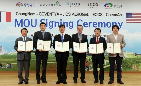 안희정 충남지사는 23일 도청 대회의실에서 미국 지오스 에어로젤(JIOS AEROGEL) 제임스 리(James S. Lee) 사장과 프랑스 코벤티아(Coventya) 토마스 코스타(Thomas Costa) 사장, 코벤티아 코리아 백승관 대표, 중국 에코스(ECOS) 신대권 사장, 전병욱 천안부시장 등과 투자양해각서(MOU)를 체결했다.