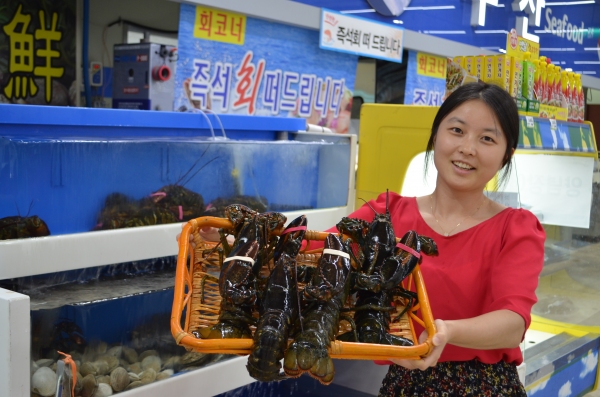 10일 대전 중구 안영동 뿌리공원 입구에 위치한 농협하나로클럽에서 ‘싱싱한 싱싱한 활(活) 로브스터 반값 할인 행사’가 열려 관계자가 로브스터를 홍보하고 있다. 이곳에선 로브스터 1마리(800g 내외)가 오는 20일까지 2만 7800원에 할인 판매된다.