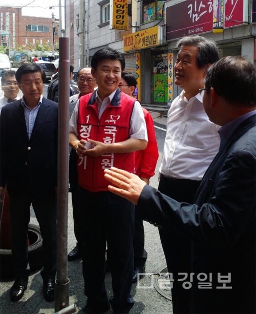 지난 19일 대전 대덕구를 방문한 새누리당 김무성(오른쪽에서 두 번재) 대표가 7·30 국회의원 보궐선거에 출마한 정용기 후보와 함께 중리시장을 둘러보며 지원 유세를 하고 있다. 정용기 후보 제공